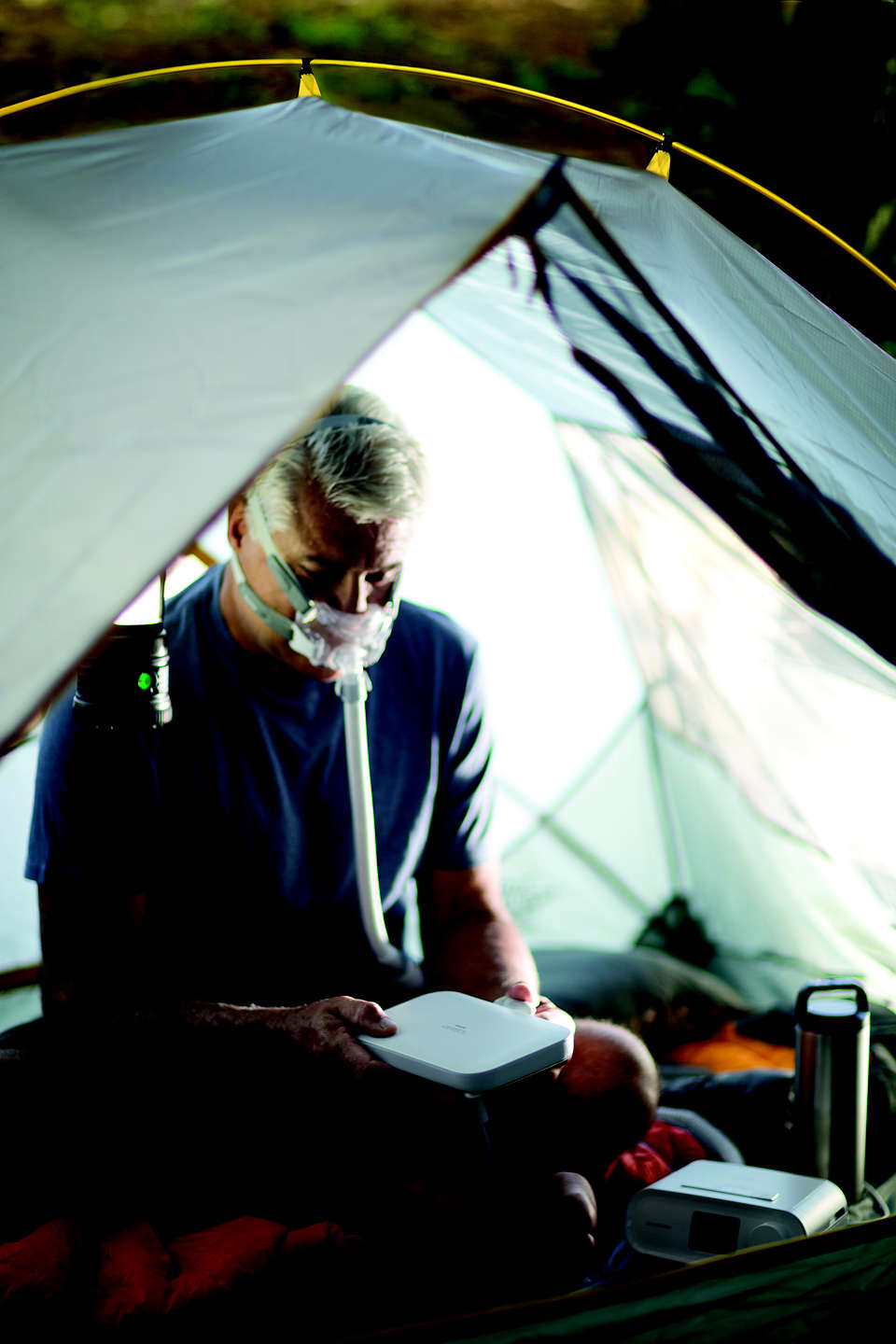 Ideal für den mobilen Einsatz beim Camping oder auf Reisen. Der Akku ist mit dem Netzteil des Philips Schlaftherapiesystems kompatibel, wodurch die Anzahl der auf Reisen benötigten Kabel reduziert wird. Außerdem entspricht er den Anforderungen der FAA für Flugreisen.